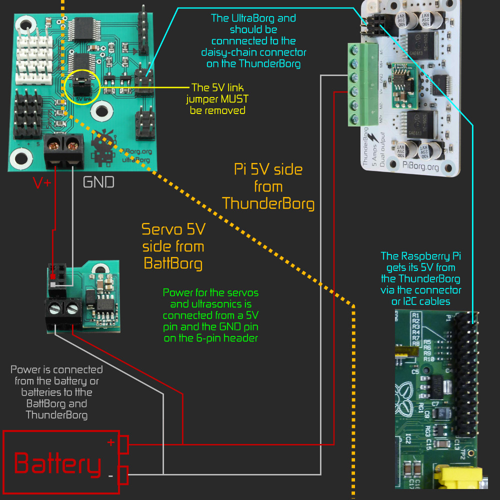 You will either need a BattBorg or UBEC to power the UltraBorg / servos as the ThunderBorg cannot supply enough 5V power for both the Raspberry Pi and all four servos at once.