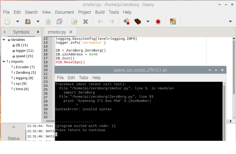 I recently rebuilt a Raspberry Pi W Zero and I'm now experiencing difficulty with the ZeroBorg.py file. The code was downloaded following instructions here https://www.piborg.org/blog/build/zeroborg-build/zeroborg-getting-started. I've attached a screenshot of the error I'm experiencing.