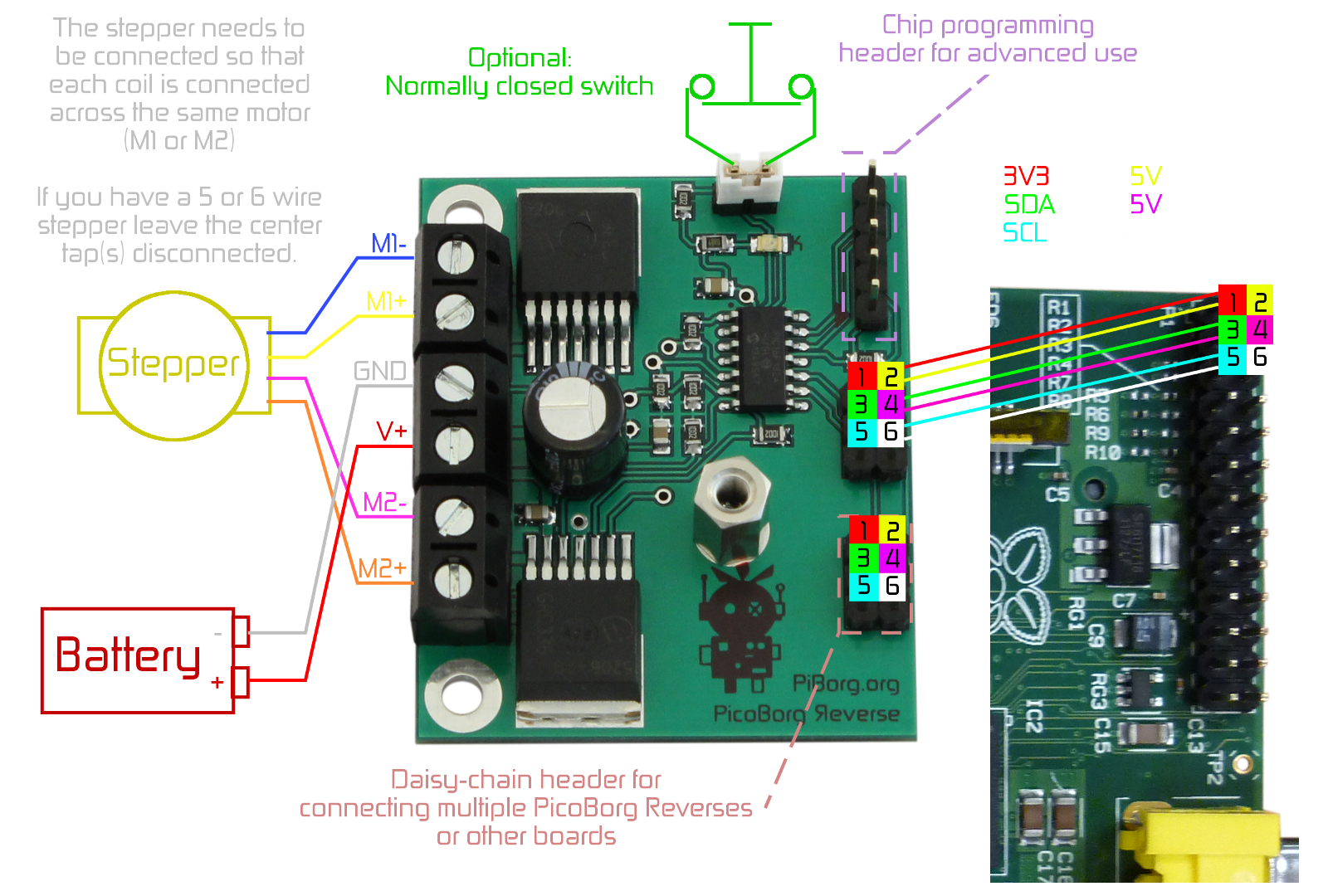 The shown stepper connection colours are based on the following internal wiring for the stepper: